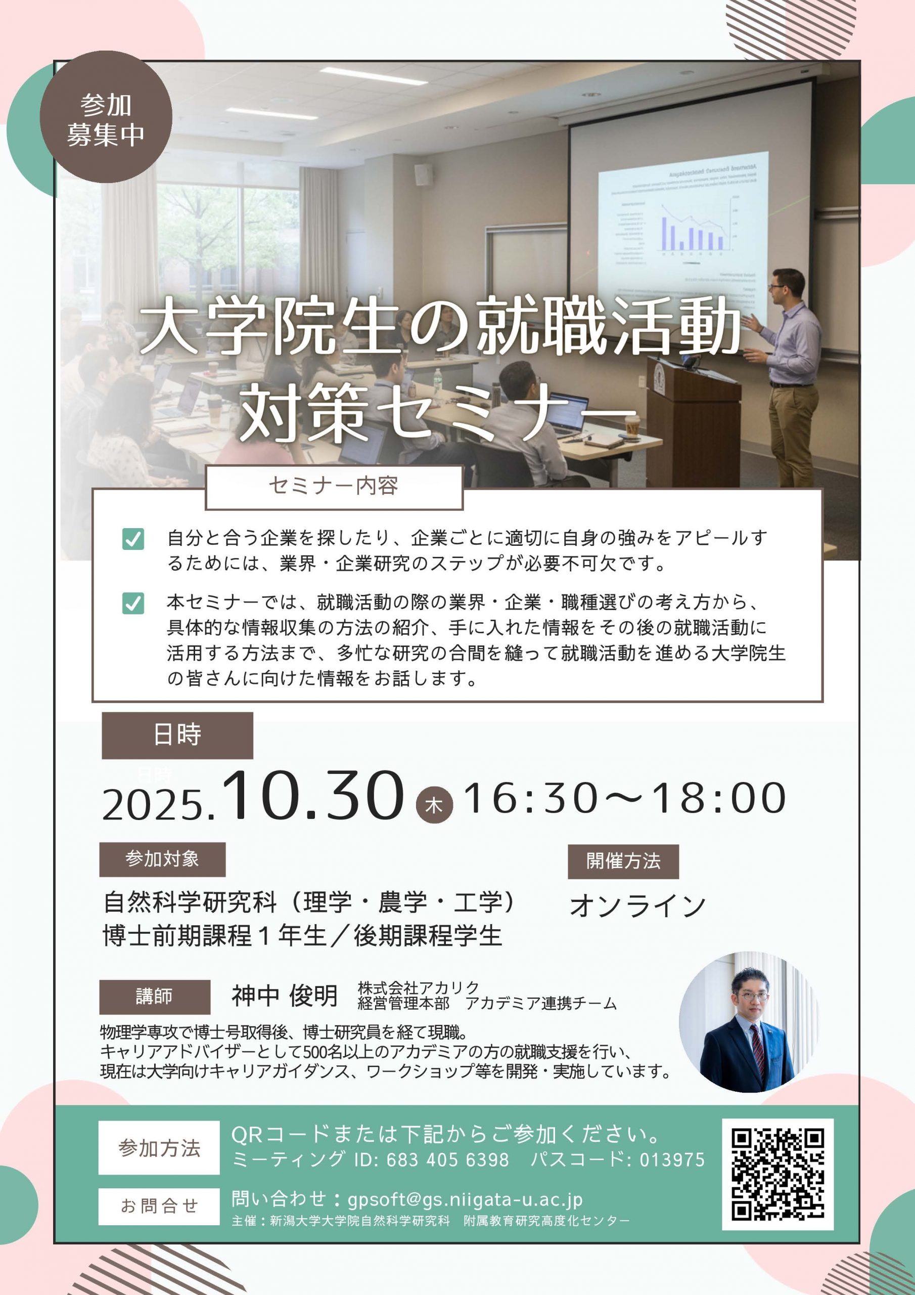 自然科学研究科の博士前期課程1年生、後期課程の学生が対象となります!気になる方はぜひご参加ください。